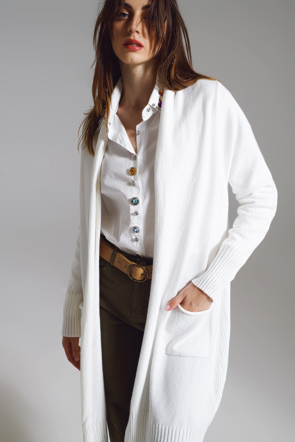 Long thin cardigan in very soft and comfortable knit. With rib detailing at the cuffs and hem and pockets on the side this is the best layering piece during the colder months of the year.