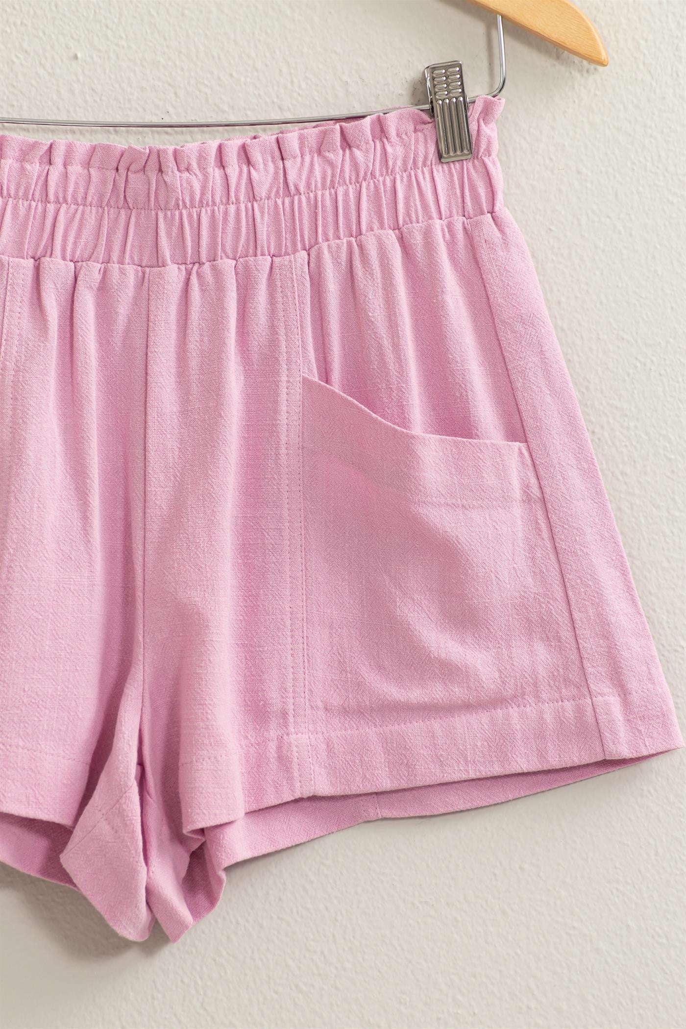 Breezy high waisted linen shorts with elastic waistband and pockets.